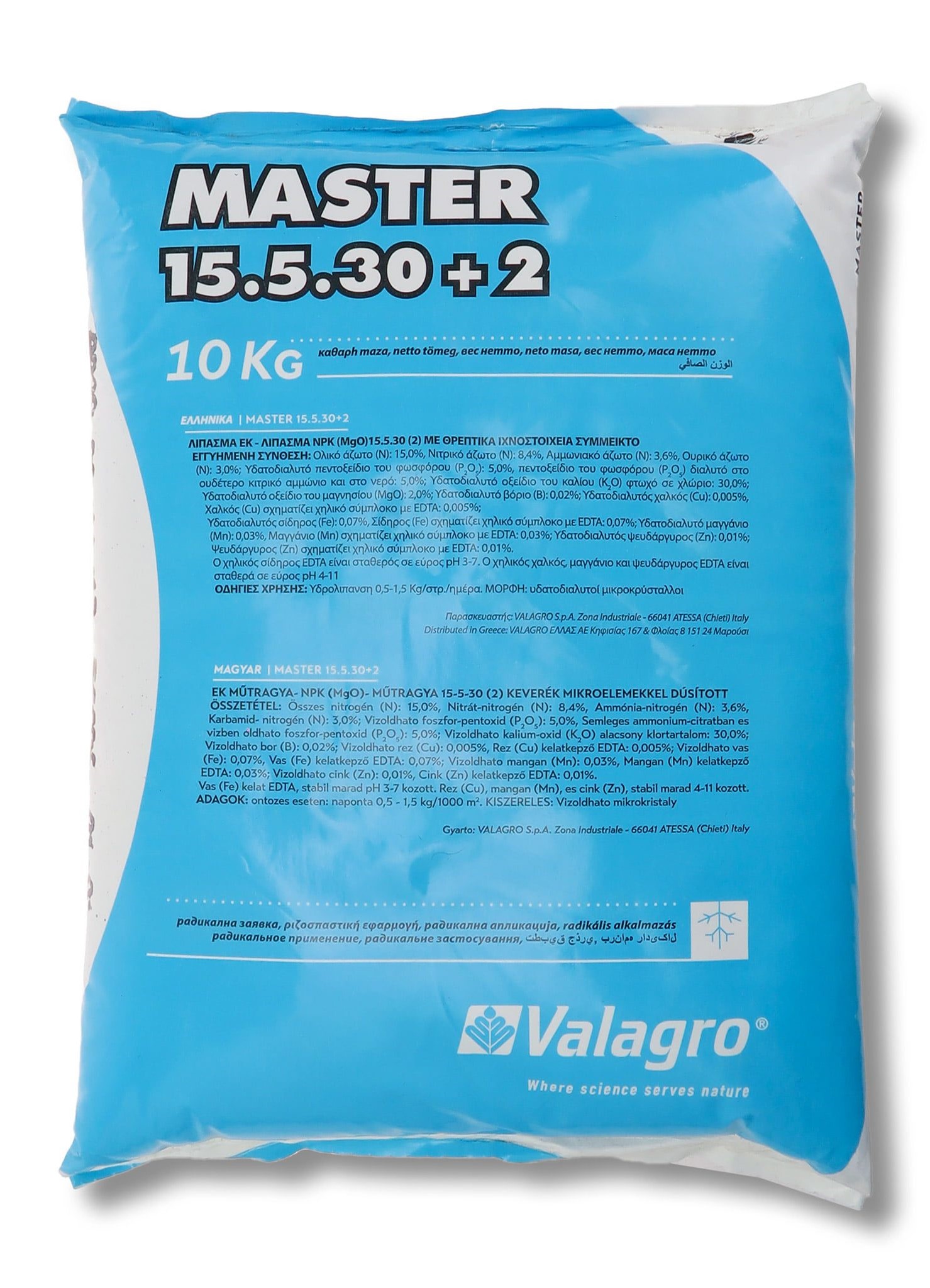 کود 15.5.30 NPK مستر کود کامل حاوی 15% نیتروژن، 5% فسفر، 30% پتاسیم و کلیه عناصر میکرو می‌باشد. در این ترکیب، پتاسیم نسبت به نیتروژن و فسفر درصد بالاتری دارد، به همین دلیل این کود، ترکیب مناسبی برای رسیدن میوه و افزایش باردهی محصول است. این کود بصورت میکرو کریستال بوده و عناصر میکرو در این کود با کلات EDTA ترکیب شده‌اند. که از این نظر دارای تاثیر‌گذاری و سرعت جذب بسیار مطلوبی هستند. این ترکیب عاری از عناصر مضر مانند کلر و سدیم می‌باشد.